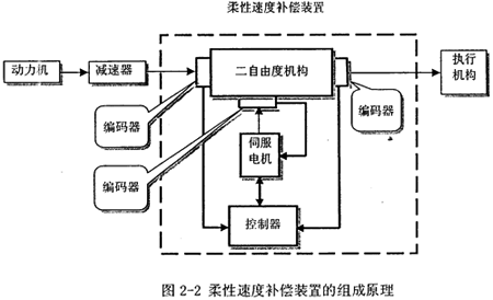 該柔性速度補(bǔ)償裝置設(shè)計(jì)為二個獨(dú)立的單元,安裝在減速器和執(zhí)行機(jī)構(gòu)之間。如圖2-2所示,簡單而言其組成包括:一個二自由度機(jī)構(gòu)、一個伺服電機(jī)、一個控制器以及三套編碼器?刂破魍ㄟ^編碼器監(jiān)控二自由度機(jī)構(gòu)的輸出軸(即執(zhí)行機(jī)構(gòu)的輸入軸)的速度,若速度波動超過預(yù)設(shè)的許用值,則控制伺服電機(jī)調(diào)整二自由度機(jī)構(gòu)的一個輸入,從而實(shí)現(xiàn)速度波動的柔性補(bǔ)償。