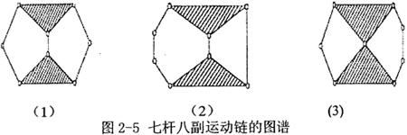 對于(5,5)來說,只有一種連接方式,作為一種混合動力驅(qū)動系統(tǒng)已有人做過研究,在本論文中,不能滿足設(shè)計(jì)要求,因此不可;而(9,11)及以上又有40個(或更多)運(yùn)動鏈之多,且構(gòu)件多結(jié)構(gòu)復(fù)雜,研究起來非常困難,暫不考慮;先考慮(7,8)七桿八副機(jī)構(gòu),其構(gòu)建數(shù)量不是太多,結(jié)構(gòu)不是太復(fù)雜,共有3個運(yùn)動鏈(如圖2-5),特定化后又有11種(排除同構(gòu)的機(jī)構(gòu))特定化導(dǎo)出機(jī)構(gòu),可以從中選擇可能適合的方案,因此以下將對(7,8)來詳細(xì)分析研究。