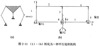 方案一:將(3)-(a)一般化鏈的所有連桿標(biāo)號,再分配其中三副桿1作為機(jī)架,哪圖2-9(a)所示,這樣特定化后,再進(jìn)一步轉(zhuǎn)化為(b)圖所示的裝置,連桿5改為滑塊,桿2作為第一輸入,第二輸入可以設(shè)定是滑塊5在桿4上的移動,可由伺服電機(jī)驅(qū)動,桿7作為輸出桿,可以滿足設(shè)計(jì)的初步要求。