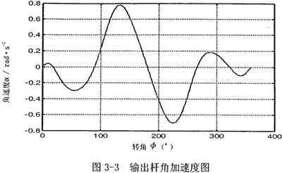 首先由圖3-2可以看到,若機構(gòu)結(jié)構(gòu)參數(shù)設(shè)計恰當,并且調(diào)整中間滑塊3偏移到合適的位置時,可在一定范圍內(nèi),產(chǎn)生一個反向的速度波適度抵消原速度波動。再由圖3-3可知,在未加入第二自由度時,加速度變化值不大,說明阻力矩和電機主動力矩不會受到大的影響,不致導致原機械系統(tǒng)的各項參數(shù)發(fā)生大的變化。