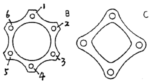 疊片聯(lián)軸器的結(jié)構(gòu)如上圖所示,其兩邊各有一組疊片,左側(cè)聯(lián)接發(fā)動機(jī)的法蘭盤,其中三個主動螺栓(如1,3,5)與疊片組相連,三個從動螺栓聯(lián)接疊片組與中間軸的法蘭盤。右邊一組同理。在傳遞扭矩時,一部分金屬疊片被拉伸,另一部分受到壓縮而趨向波折。當(dāng)存在軸向、徑向和角向偏移時,疊片產(chǎn)生波狀變形。