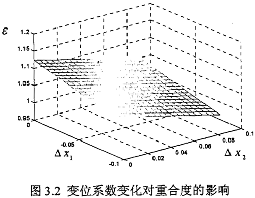 由式3.10、3.11可以看出,當(dāng)總變位系數(shù)xΣ=x2-x1產(chǎn)生變化時,必然引起起嚙合齒輪齒頂圓直徑的變化。按X1、X2變化最小原則,有三種可能性,即X1不變,X2變化0~0.18;或X1變化0~0.18,X2不變;或X1變小,X2變大,變化范圍0~0.09。假定齒輪嚙合角不變,按本文實驗樣機(jī)參數(shù),當(dāng)齒輪變位系數(shù)發(fā)生變化時,其變化量對重合度的影響狀況見圖3.2所示。從圖3.2所示可以看出,隨外齒輪變位變小時,齒輪嚙合重合度減小,隨內(nèi)齒輪變位變小時,齒輪嚙合重合度增大,從圖中的變化趨勢為看,外齒輪變位系數(shù)的變化對重合度的影響程度與內(nèi)齒輪變位系數(shù)的變化對重合度的影響程度大約是相同的,只是趨向是反向的。