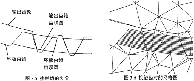 環(huán)板內(nèi)齒輪與輸出軸齒輪之間的傳動是直齒輪傳動,為保證進(jìn)行接觸計算時,有較多的有較接觸區(qū)域,齒輪輪齒部分的有限元網(wǎng)格采用映射網(wǎng)格劃分法(Mapped Meshing)對齒輪進(jìn)行有限元網(wǎng)格劃分。同時,為保證兩對嚙合齒輪所劃分的網(wǎng)格接觸對相應(yīng)的面能對應(yīng)齊,因此齒輪嚙合的接觸面相應(yīng)應(yīng)當(dāng)齊整。用輸出軸齒輪的齒頂面所在的輪廓曲面對環(huán)板內(nèi)齒進(jìn)行劃分(partition 命令),同理用環(huán)板內(nèi)齒的齒頂面所在的輪廓曲面對輸出軸齒輪進(jìn)行劃分,這樣得到對應(yīng)齊整的齒輪嚙合的接觸面,如圖3.5所示。根據(jù)圖3.5所示,采用映射網(wǎng)格劃分法( Mapped Meshing)進(jìn)行網(wǎng)格劃分的輪齒部分即是圖中輸出齒輪齒頂圓與環(huán)板內(nèi)齒齒頂圓之間所劃分的部分,而其余部分采用自由網(wǎng)格劃分法(Free Meshing)進(jìn)行劃分,劃分網(wǎng)格后的部分網(wǎng)格圖見圖3.6所示。考慮實際接觸齒對數(shù)不會太多,所以每塊環(huán)板上只給出6個輪齒進(jìn)行接觸計算。環(huán)板嚙合的實際過程是環(huán)板齒輪帶動輸出齒輪運動,計算時為方便,假設(shè)環(huán)板固定不動,設(shè)定輸出軸繞軸線轉(zhuǎn)動,將減速器的輸出功率換算為輸出扭矩,加在輸出軸的輸出端。