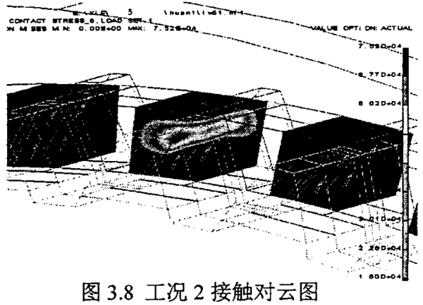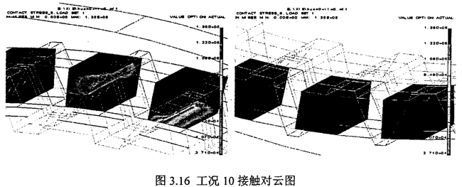 工況六至工況十這四和情況,是指兩環(huán)板之間不對稱,即偏心軸的兩個偏心拐的尺寸誤差不一致,這里考慮的是特殊狀況,從表3.10-3.13看出,當(dāng)兩環(huán)板不對稱時,將產(chǎn)生嚴(yán)重的載荷不均現(xiàn)象,載荷偏向中心距小的環(huán)板內(nèi)齒上,甚至只有一個環(huán)板承受載荷。由此說明,對于雙環(huán)減速器偏心軸有加工,應(yīng)特別注意兩曲捌的制造誤差,應(yīng)盡量使安裝好的兩環(huán)板具有較好的對稱性。圖3.7~圖3.12為六種工況下環(huán)板內(nèi)齒的接觸齒對的應(yīng)力云圖。