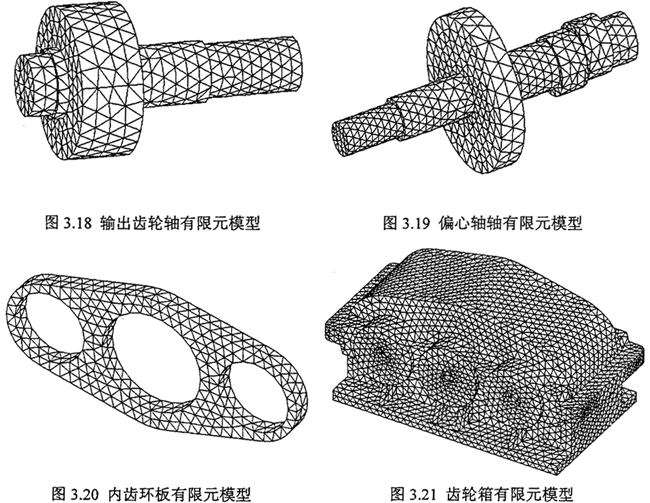 采用四節(jié)點四面體單元,利用軟件自由網(wǎng)格劃分法(Free Meshing )對輸出齒輪軸進(jìn)行有限元網(wǎng)格劃分。減速箱的其它零件采用相同的方法進(jìn)行有限元建模,圖3.18為輸出齒輪軸的有限元網(wǎng)格模型共劃分為3021個單元,835個節(jié)點,圖3.19為偏心軸的有限元網(wǎng)格模型,共劃分為4098個單元,1188個節(jié)點,圖3.20 為環(huán)板的有限元網(wǎng)格模型,共劃分為1505個單元,594個節(jié)點。
