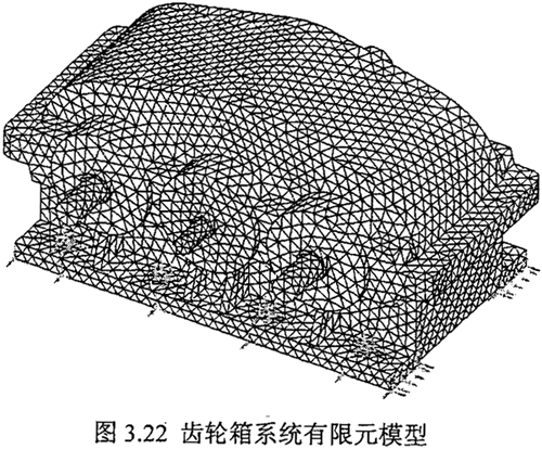 雙環(huán)減速器箱體是用鑄鐵鑄造而成,不考慮或?qū)Ψ治鲇绊懮跷⒌慕Y(jié)構(gòu)特征,如小孔、園角、倒角、螺栓孔等,在進(jìn)行減速箱實體建模時,忽略上述因素的影響,同時將箱蓋與箱體合為一體,而齒輪箱與前后端蓋、軸承組合而成,結(jié)構(gòu)比較復(fù)雜,建模時不考慮頂蓋與箱體、前后端蓋、軸承與箱體的接合部的影響。軸承采用相同尺寸的圓環(huán)套,而其材料性質(zhì)用具有與軸承等效剛度相同的材料參數(shù),這些處理不會對齒輪箱體的重量及剛度產(chǎn)生大的影響,完全能保證足夠的計算精度。用自由網(wǎng)格劃分方法(Free Meshing),采用八節(jié)點四面體單元劃分網(wǎng)格,圖3.21為所建立的齒輪箱有限元模型網(wǎng)格,節(jié)點數(shù)為8761,單元數(shù)為28286。前面分別建立了齒輪系統(tǒng)主要零件和箱體的有限元網(wǎng)格,將簡化后的軸承用相同的方法進(jìn)行有限元網(wǎng)格劃分,再用I-DEAS軟件的APPED命令將齒輪系統(tǒng)的各零部件集成為整個系統(tǒng)的有限元網(wǎng)格模型,如圖3.22 所示。