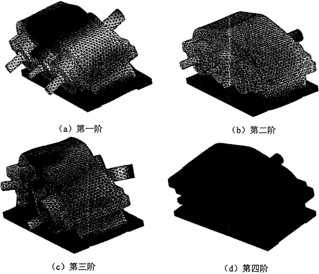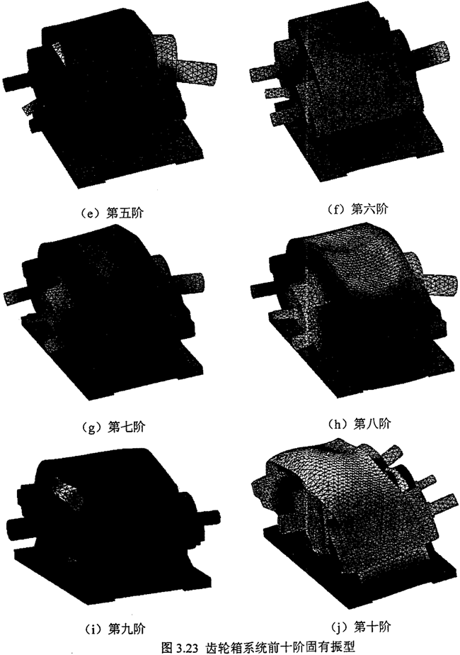 如圖3.22 所示的齒輪系統(tǒng)有限元模型,根據(jù)實際的安裝情況,為了能比較準(zhǔn)確地反映實際狀態(tài),箱體的邊界條件為:箱體底座垂直方向約束,四個螺栓孔處全部固定約束。則研究齒輪系統(tǒng)的約束模態(tài),表3.14~3.15分別為用I-Deas軟件的Lanczos模態(tài)求解法計算得到的各重要零部件及齒輪系統(tǒng)前上10階固有頻率和響應(yīng)的振型情況。限于篇幅,圖3.23給出了齒輪系統(tǒng)的前十階固有振型。