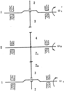 三環(huán)減速器實質上就是一種雙曲柄輸入式、內齒輪作圓周平動而外齒輪用于輸出的少齒差行星齒輪傳動機構。原理如圖2-1所示。雙曲柄機構1-1以轉速ω1輸入運動,通過連桿2及與連桿相固連的內齒輪了將運動傳給外齒輪4,并通過外齒輪4將運動傳遞給5ω2輸出運動和動力,其傳動比為: