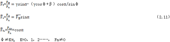 理論上,該力僅在ф=Kπ點產(chǎn)生,而FA、FB將在此點處趨于無窮大?紤]實際結構的彈性變形等因素,F(xiàn)Br應在ф=Kπ的一轉角領域內ф=Kπ±△ф產(chǎn)生,而FB、FA在該鄰域內由正(或負)向峰值過零轉變?yōu)樨摚ㄕ┫蚍逯,如圖2-10所示。這是因為FB、FA在死點位置附近迅速增大產(chǎn)生的彈性變形也會使環(huán)板產(chǎn)生微小反轉角度,而導致FBr的產(chǎn)生,顯然該微小角度領域的大小以及FB、FA所能達到的峰值決于環(huán)板的剛度。剛度越大,該領域越小,F(xiàn)B、FA峰值越大,F(xiàn)Br的大小與嚙合力及無量綱參數(shù)(γ+β)成正比。一般情況下,高速重載的三環(huán)減速器、環(huán)板機構的剛度嚙合力等均較大,因此死點處受到的沖擊越大,且沖擊脈沖寬度。ǚ幢扔诮撬俣龋,激振頻率更寬,更易激起廣泛的共振。