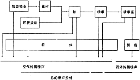 從圖中可知,固體傳播噪聲是由傳遞中的振動激勵引起的,環(huán)板沖擊及輪齒嚙合振動通過軸、軸承、軸承座傳向箱體和機座;引起振動而輻射的噪聲通過箱壁向外輻射,此外,由軸的振動引起的噪聲的一部分直接向箱體外輻射。