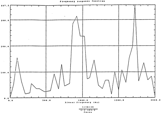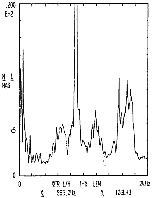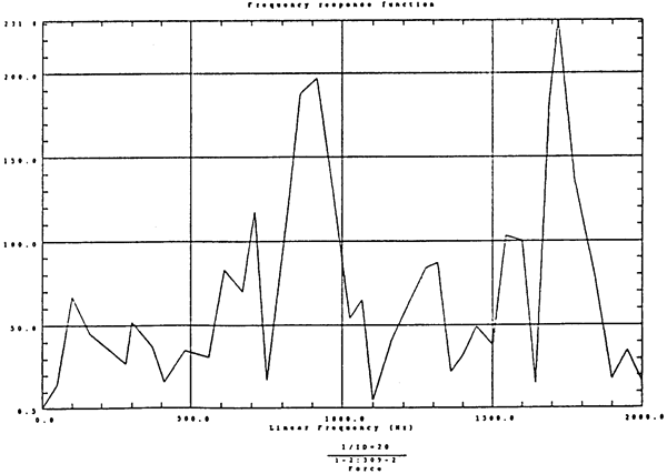 有了脈沖激勵(lì)信號(hào)和脈沖響應(yīng)信號(hào)后,CF-355頻譜分析儀就能計(jì)算出測(cè)點(diǎn)12X向由于14點(diǎn)X向激勵(lì)間的頻響函數(shù)H(ω)及其相干函數(shù),如圖4-5所示。圖4-6是頻響函數(shù)H(ω)的倒數(shù)。