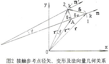通常情況下,變形量相對(duì)于曲面參考點(diǎn)徑矢的大小為微小量,其切向分量更小,主要由撓曲變形引起。由(2-6-1)式知,γ值非常小。一般情況下,可忽略這一法線方向的改變,認(rèn)為變形后的接觸參考點(diǎn)法線方向不變,以便于求解。