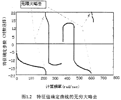 Pilkey和Leckie開(kāi)發(fā)的用于分析帶分支系統(tǒng)扭振系統(tǒng)的傳遞矩陣法包括將分支系統(tǒng)簡(jiǎn)化為一個(gè)等效單轉(zhuǎn)子系統(tǒng)。這種方法要求將分支系統(tǒng)的參數(shù)累加在分支系統(tǒng)所屬的軸段上。因?yàn)檫@種方法要求從主傳遞矩陣上消去分支系統(tǒng)的狀態(tài)關(guān)系,這會(huì)導(dǎo)致用根搜索法求解時(shí)丟到合理的根。如下圖1-2所示的一個(gè)頻率范圍內(nèi)的分支系統(tǒng)的特征曲線(xiàn),因?yàn)闊o(wú)限大而略去的特點(diǎn)會(huì)導(dǎo)致丟根。