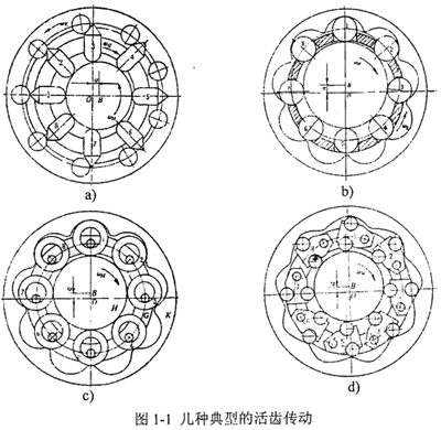 活齒少齒差行星傳動簡稱為活齒傳動,是由K-H-V型少齒差行星齒輪傳動演化而成的一種新型齒輪傳動,并利用一組中間活動件——活齒來傳遞兩同軸間的回轉運動。常見的活齒傳動分為推桿活齒傳動(圖1-la)、滾柱(鋼球)活齒傳動(圖1-1b)、套筒活齒傳動(圖1-1c)、擺動活齒傳動(圖1-ld)等。因為活齒傳動具有結構緊湊、傳動比范圍廣、承載能力大、傳動效率高等優(yōu)點,所以它一出現(xiàn)就引起科技工作者的廣泛注意。