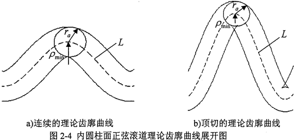 以殼體的正弦滾道為例,將殼體的內(nèi)圓柱面沿圓柱直母線方向展開后如圖2-4所示。當(dāng)殼體內(nèi)圓柱面上正弦軌跡曲線L的最小曲率半徑ρmin大于活齒嚙合部分小圓半徑ra時,殼體正弦滾道的理論齒廓曲線是連續(xù)的(圖2-4a);當(dāng)ρmin<ra時,理論齒廓曲線發(fā)生頂切(圖2-4b)。殼體內(nèi)圓柱上正弦軌跡曲線L的方程可表達(dá)為: