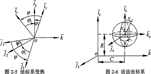 為建立該傳動的嚙合方程,使在不同坐標(biāo)系中的各個矢量進(jìn)行計算,需將所有矢量轉(zhuǎn)換到統(tǒng)一的坐標(biāo)系中,為方便求解,將所有矢量均轉(zhuǎn)換到導(dǎo)架的坐標(biāo)系σ2中。