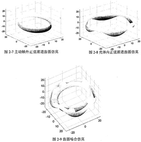 采用Matlab工程軟件對圓柱正弦活齒傳動進(jìn)行齒面仿真的研究。為仿真出三維曲面,在接觸線上劃分100個單元,在齒面圓周方向劃分1001個單元,由此將齒廓曲而劃分為100×1001的網(wǎng)格。根據(jù)數(shù)學(xué)模型計算出各個網(wǎng)格節(jié)點對應(yīng)的數(shù)值,得到齒廓曲面的網(wǎng)格圖,然后采用二維線性插值的方法,得到整個齒廓的曲面仿真及齒面嚙合偏真如圖2-7~圖2-9所示。
