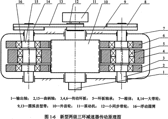 其工作原理為:小同步帶輪12隨原動機(jī)11作高速旋轉(zhuǎn),通過嚙合,小帶輪通過平頂圓弧齒型帶9和13帶動兩個大帶輪8和14旋轉(zhuǎn),實現(xiàn)一級減速和功率分流,兩個大帶輪分別帶動三環(huán)減速器的雙曲柄的同步輸入,三環(huán)減速器的雙曲柄的同步輸入,三片傳動環(huán)板3、4和6上的內(nèi)齒圈與輸出軸1上的外齒輪10相嚙合,形成大傳動比,實現(xiàn)二級減速及動力傳遞。三內(nèi)齒環(huán)板中的兩側(cè)環(huán)板與中間環(huán)板相差180°,且兩側(cè)各環(huán)板厚度為中間環(huán)板的1/2,這樣可保證運(yùn)轉(zhuǎn)時它們的慣性力理論上完全平衡。為克服雙曲柄機(jī)構(gòu)的死點,一級傳動采用同步帶傳動,增加了一級帶傳動不僅可實現(xiàn)兩個曲柄機(jī)構(gòu)的同步輸入,同時,由于同步齒形帶是彈性元件,還可實現(xiàn)兩曲柄軸載荷均載。三環(huán)減速器輪齒嚙合的均載是采用在兩曲柄軸偏心套外表面和轉(zhuǎn)臂軸承內(nèi)表面之間插入一個浮動圓筒16,在曲柄軸旋轉(zhuǎn)時,偏心套和圓筒之間、圓筒和轉(zhuǎn)臂軸承內(nèi)表面之間均形成了動壓油膜,厚油膜的彈性變形使得內(nèi)齒環(huán)板浮動,補(bǔ)償減速器的制造和安裝誤差以及傳動時產(chǎn)生的零部件變形。樣機(jī)的傳動性能和振動性能以及均載試驗證實,本文提出的完全平衡、均載減振兩級三環(huán)齒輪減速器有著較好地力學(xué)性能,較現(xiàn)有三環(huán)減速器的振動要小、壽命要長。