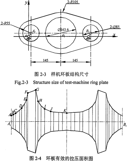 三環(huán)減速機運動屬靜不定問題,用一般平面剛體力學(xué)方法無法完全求出機構(gòu)的作用力,影響到三環(huán)減速器設(shè)計和傳動性能的改進。為此需要考慮各構(gòu)件的變形,建立能充分反映三環(huán)減速器實際受力的變形協(xié)調(diào)條件作為補充方程。三環(huán)減速機傳動機構(gòu)是雙曲柄連桿機構(gòu),曲柄的旋轉(zhuǎn)半徑是偏心軸的偏心距,曲柄布置在由支撐軸承支承的偏心軸上,環(huán)板是雙曲柄機構(gòu)的連桿,傳動過程中的主要變形有各構(gòu)件的接觸變形、軸的扭轉(zhuǎn)彎曲變形、環(huán)板的拉壓變形等等。根據(jù)位移變形分析可知,軸的彎曲變形和環(huán)板的拉壓變形是主要的變形形式。對于筆者設(shè)計的如圖2-3所示的環(huán)板,設(shè)A為輸入軸,B為輸出軸。為了計算上的方便,以前將其簡化為等截面桿處理。實際上,由于有效截面的最大面積是最小截面面積的5倍多,這種簡單地處理和實際有較大的差別。環(huán)板受拉壓變形時的有效拉壓面積的形狀如圖2-4所示(單位:mm)。