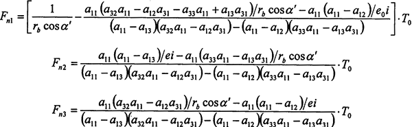 求解曲柄軸(2-24)、(2-25)和輸出軸(2-10)組成的關(guān)于嚙合力的方程組,可解得: