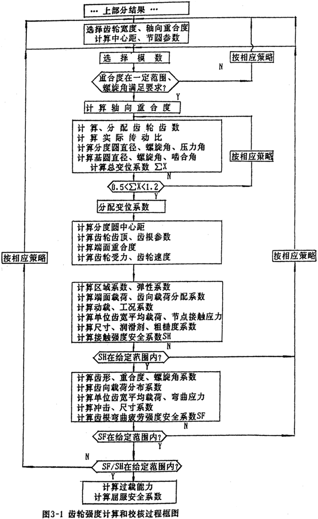 以上所討論的知識表達的各種方式均是建立在一定格式的基礎(chǔ)上的,可以說是知識的描述性(declarative)表達方式。這類知識的表示一般具有模塊性,自然性,清晰性等。但正是由于格式的限制,因此對于某些功能,如回溯、反復(fù)的校核計算等這樣一類操作,不如用語言編寫知識過程來得方便。用語言形式直接編寫知識過程,便有了圓柱齒輪減速器設(shè)計知識的過程表示。框圖3-l是齒輪強度計算、校核的過程框圖,這樣一個過程需要多次重復(fù)的計算。使用過程表示可使求解過程按照嵌入的程序次序進行調(diào)用,它們不需要和選擇那些不相關(guān)的知識,也不需要那些不自然的推理路徑。同時,還能夠把領(lǐng)域特有的,導(dǎo)致更為直接推理過程的啟發(fā)性知識結(jié)合到設(shè)計過程中去,因而能夠大幅度地提高運行效率。