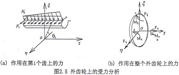 齒輪聯(lián)軸器上的受力是比較復雜的,對于外齒輪而言,除了與聯(lián)軸器連接的軸段對其的作用力外,還有內齒套對外齒輪的作用力。轉子系統(tǒng)在運動過程中,內外齒輪之間要發(fā)生相對運動,由于齒面間存在變形和摩擦,因此在外齒輪的齒面上會產生與齒面垂直的正壓力Ni和與齒面相切的摩擦力Fi,見圖2.5a。如果將各齒面上的作用力分別向外齒輪的中心O簡化可以得到作用于O點的一個力和一個力偶,并將該力和力偶分別分解到三個軸上,得到三個分力Fξ、Fη、Fz三個力偶矩Mξ、Mη、Mz,如圖2.5b所示。