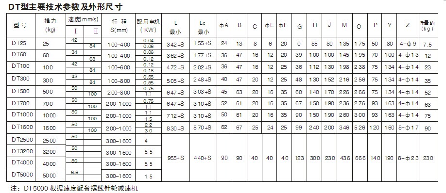 電動推桿按額定推力目前分為25、100、300、500、700、1000、1600、3200、5000、10000、20000、30000公斤等12個等級,按行程為100、200、300、400、500、600、700、800、900、1000、1100、1200、1300毫米,每種行程又有42或84,50或100,26.6或53.2兩種速度。