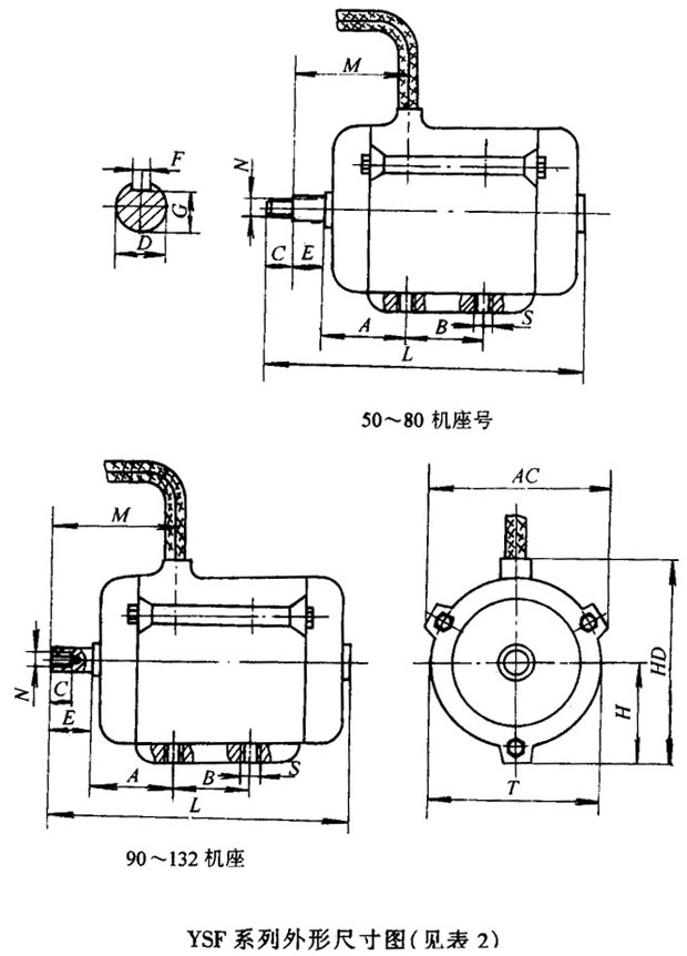 YSF系列電動(dòng)機(jī)外殼防護(hù)等級(jí)為IP44,絕緣等級(jí)為E級(jí),安裝結(jié)構(gòu)形式為IMB30,機(jī)殼上有六個(gè)螺孔與風(fēng)機(jī)固定,接線盒裝在風(fēng)筒外壁上。